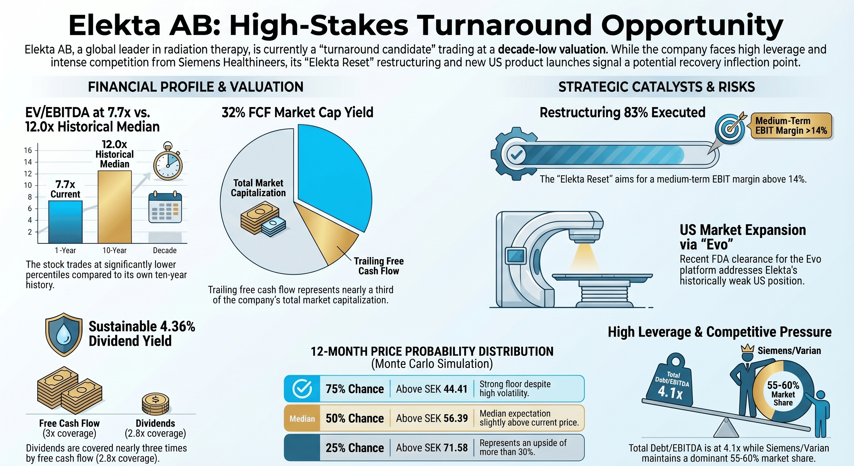 At SEK 55.05, the stock trades at a market capitalisation of roughly SEK 21 billion. Forward valuation multiples sit at lower percentiles of their own ten-year history, such as EV/EBITDA NTM at 7.7x against 12.0x. Against European Healthcare peers, the discount narrows but remains firmly in the bottom quartile. The dividend yield has climbed to 4.36%, its 93rd historical percentile. Elekta presents the classic profile of a turnaround candidate at maximum uncertainty.
